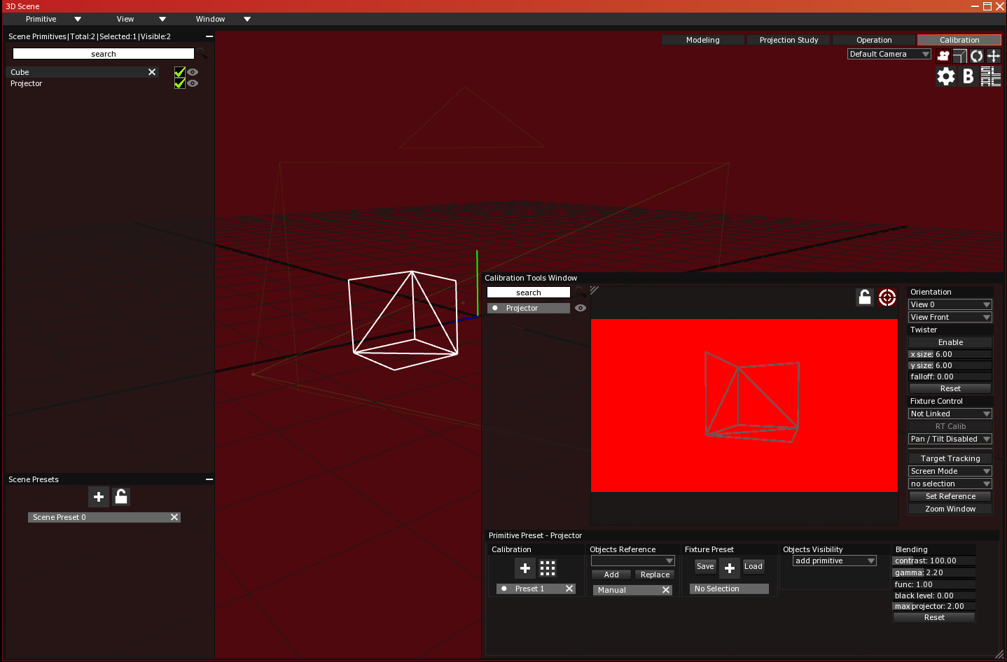 Select the 3D Scene module’s Calibration mode by pressing [4] or by clicking on the [Calibration] button located at the top-right corner of the 3D Scene window. Once the Calibration mode is enabled, the 3D Scene Preview will turn red and the Calibration Tools Window will open in the lower right part of the 3D Scene window.